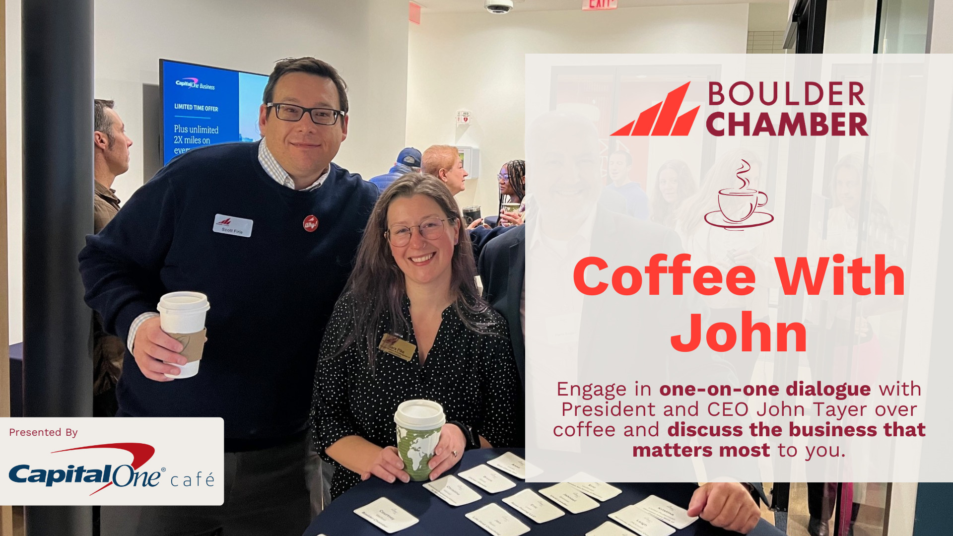 Join Boulder Chamber President John Tayer for a get-together over coffee to discuss the local topics and issues that matter to you most!