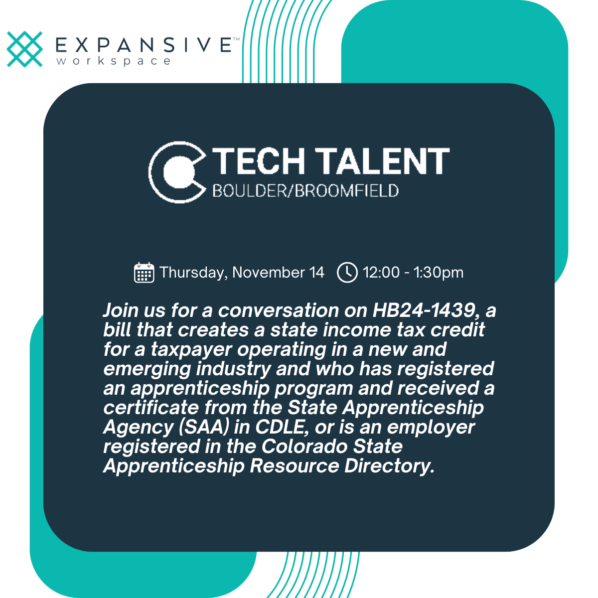 This quarter's Tech Talent: Boulder Broomfield meeting will focus on HB24-1439, a bill that creates a state income tax credit for a taxpayer operating in a new and emerging industry and who has registered an apprenticeship program and received a certificate from the State Apprenticeship Agency (SAA) in CDLE, or is an employer registered in the Colorado State Apprenticeship Resource Directory. This discussion will be led by Katherine Keegan, Director of the Office of the Future of Work at CDLE.