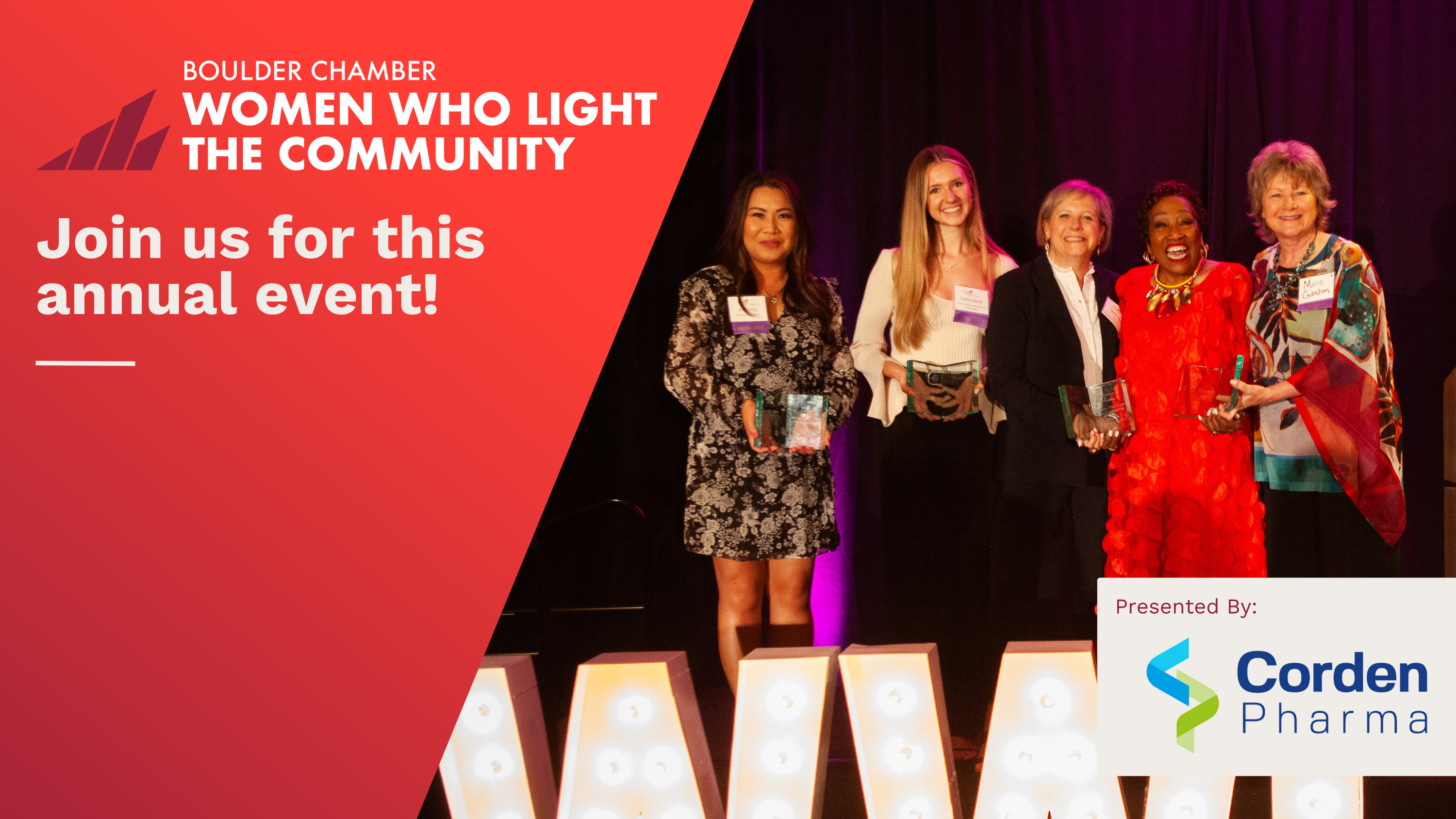 Join us in celebrating the 2024 Women Who Light the Community Honorees!Crowning over two decades of awards to outstanding women in the area, the Boulder Chamber will honor recipients at its 29th annual celebration on September 10. Celebrate local women who are changing the world.Meet inspiring leaders who shape our community.Get connected during this celebratory event.Program: 4:30pm - 5:30pm - Guests Arrival, Networking & Cocktails5:30 PM - Awards Program and Dinner Begins (in-person and online)Enjoy networking, appetizers, dinner, desserts, drinks, silent auction and more, as part of this memorable evening of inspiration.
