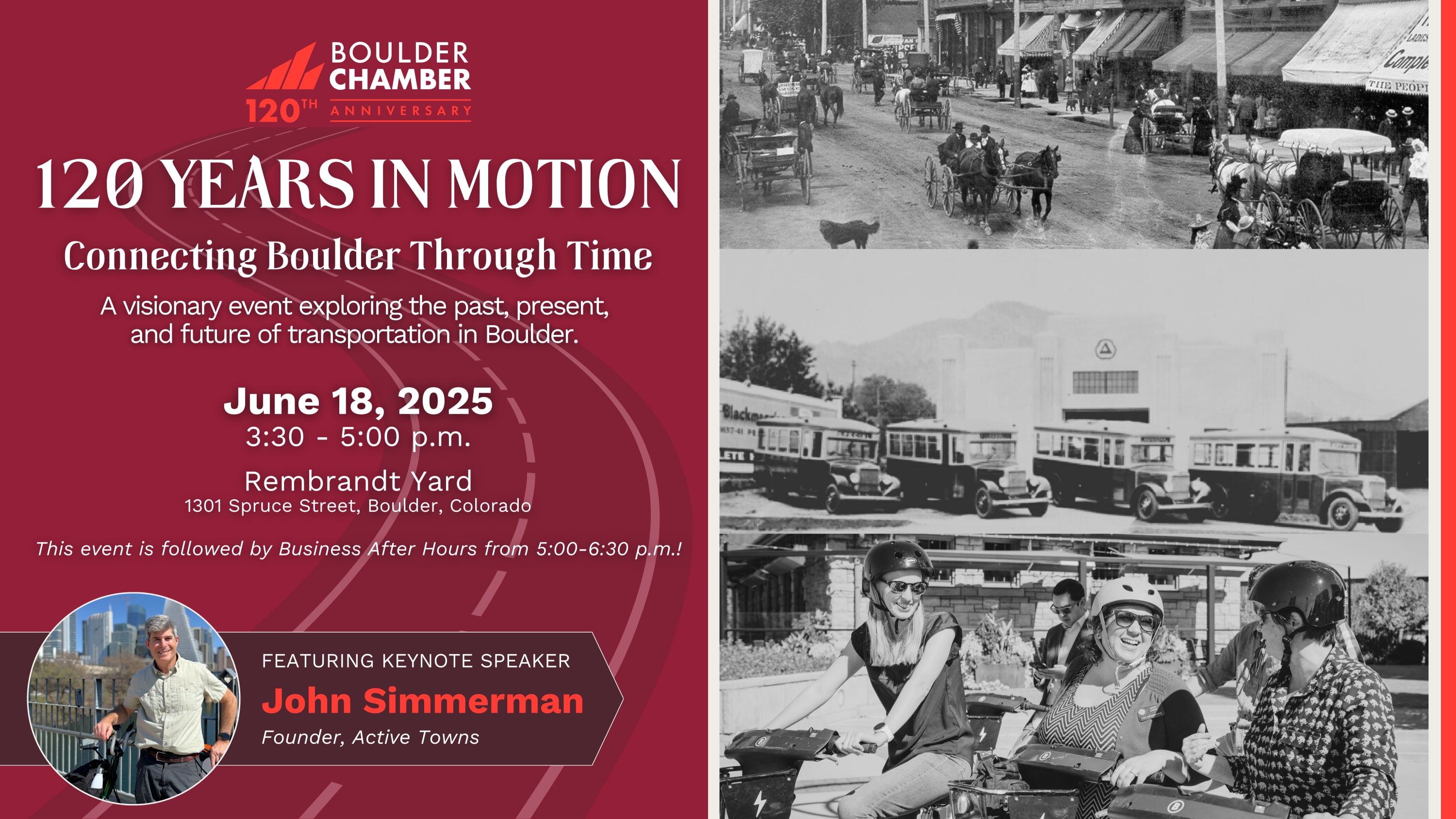 Following the keynote, stay for Business After Hours, a networking happy hour to engage with fellow community leaders, transportation advocates, and forward-thinkers. Together, we'll explore how we can continue to move Boulder into the future while honoring its rich transportation history.
