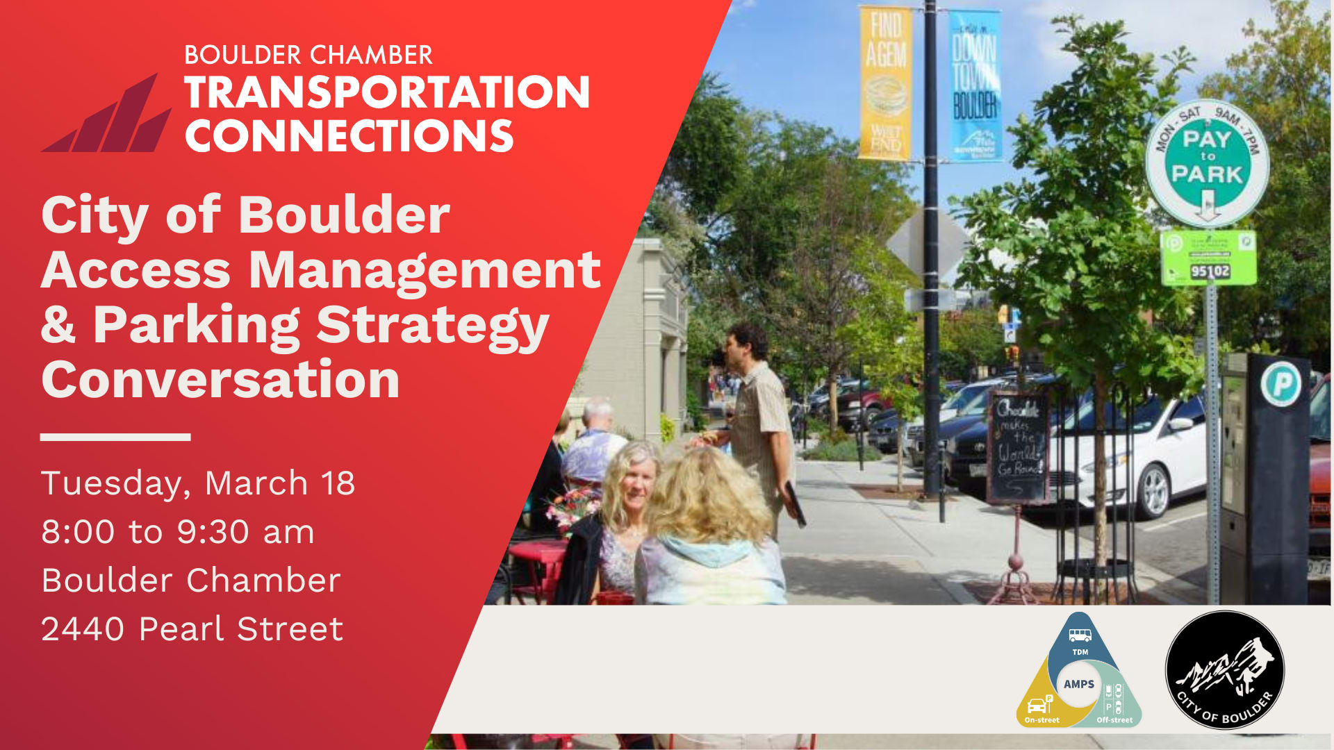 Boulder Chamber Transportation Connections and the City of Boulder invite you to share your input on the recommendations of the Access Management and Parking Strategy (AMPS) code and policy updates. This project is a multi-departmental effort to rethink parking and transportation demand in Boulder. It focuses on code and policy changes to: