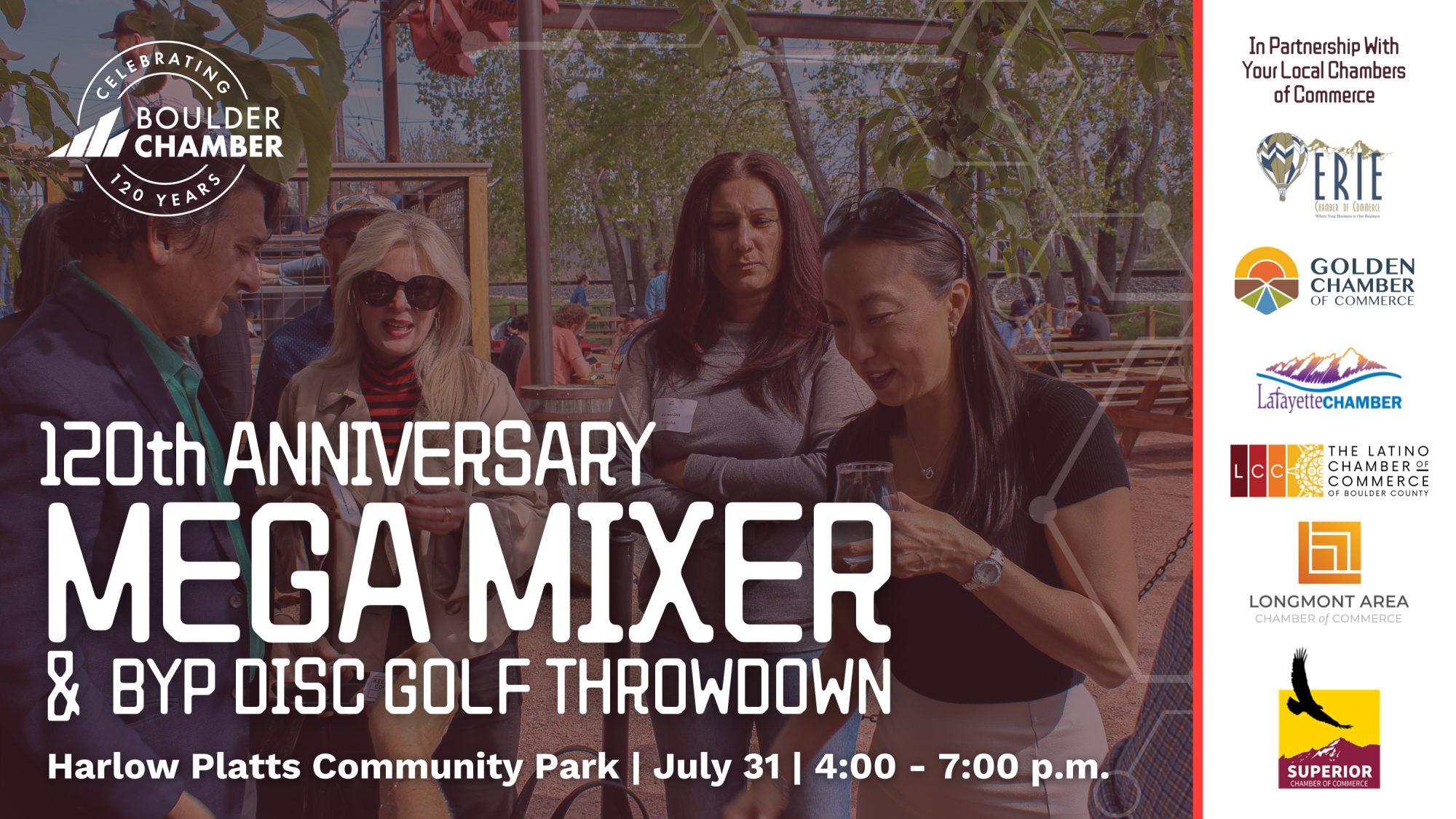We are bringing our members together for a day of fun, friendly competition, and meaningful connection across Chamber communities. As part of the Boulder Chamber’s 120th anniversary celebration, we’re expanding our annual Disc Golf Tournament into a regional event and Mega Mixer!