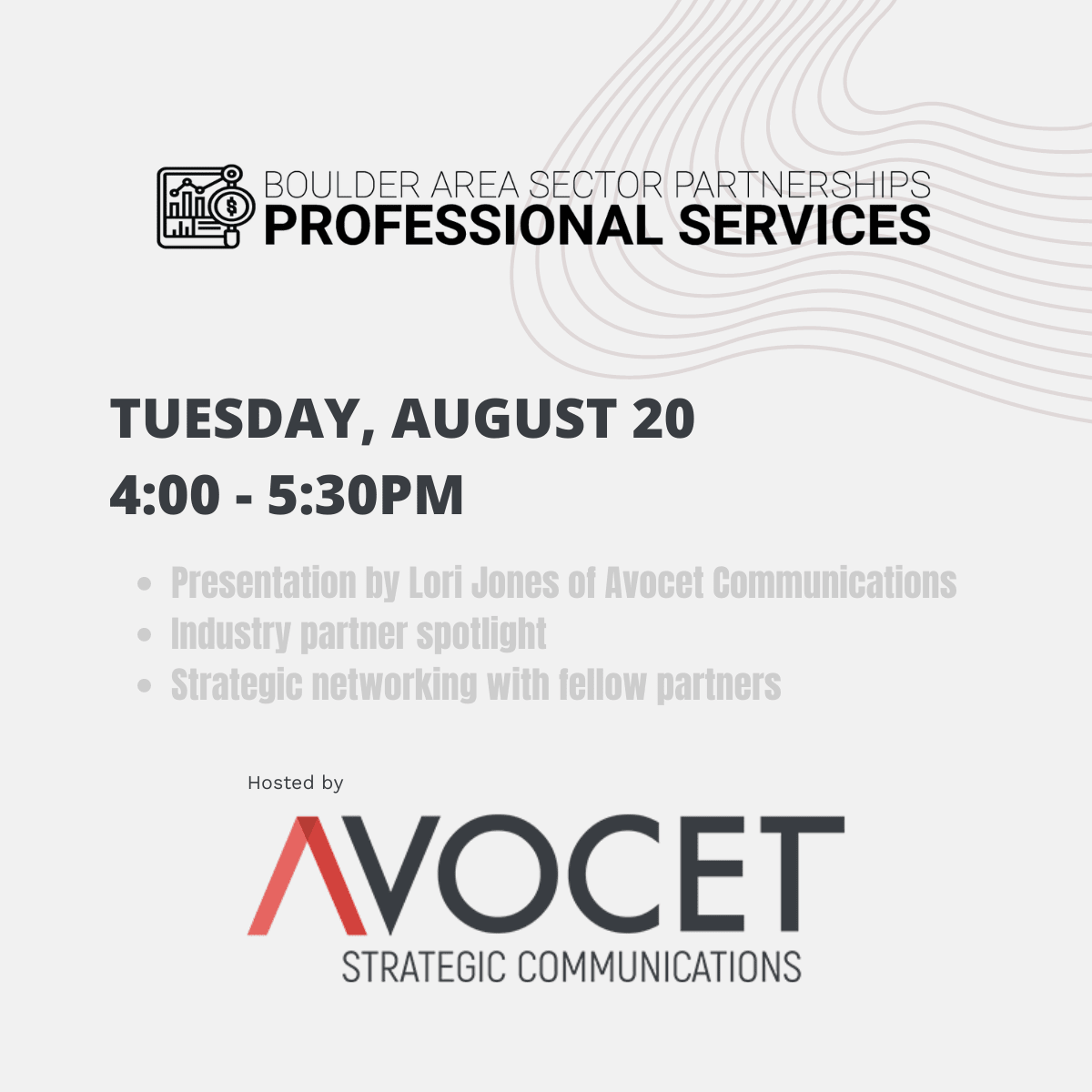 Join us for our first Boulder Area Professional Services Sector Partnership meeting following the April launch! During the meeting, hear from Avocet on identifying the right client, best practices, and their services in strategic marketing planning and integrated communication solutions. See you there!