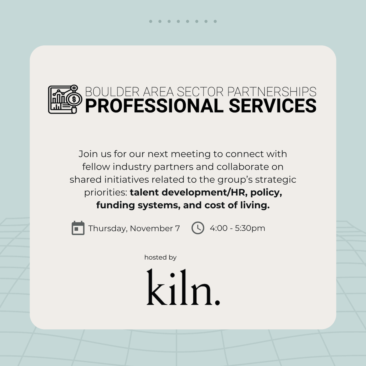 Join us for our next Boulder Area Professional Services Sector Partnership meeting hosted by Kiln. The new director of the Boulder Small Business Development Center, Sarah Wood, will be present to talk about SBDC's program and services as well as answer any questions.