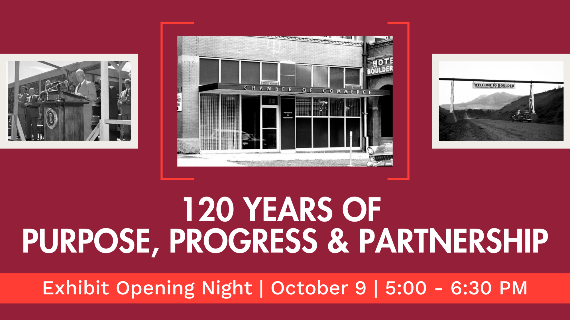 Join fellow business and community leaders as we celebrate the Chamber’s milestone year and experience the debut of Celebrating 120 Years of Purpose, Progress & Partnership. This curated exhibit traces the Chamber’s pivotal role in shaping Boulder’s growth—from the early days of tourism and transportation to the groundbreaking research, entrepreneurship, and advocacy that define our region today.