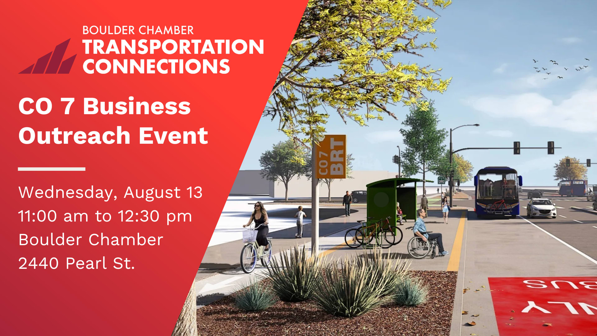 Boulder Chamber Transportation Connections and the City of Boulder's Transportation and Mobility Department invite representatives of all businesses along the CO 7 (Arapahoe Road) corridor, east of 28th Street, to join us for an open-house style facilitated discussion about progress on the CO 7 Multimodal Corridor Project.