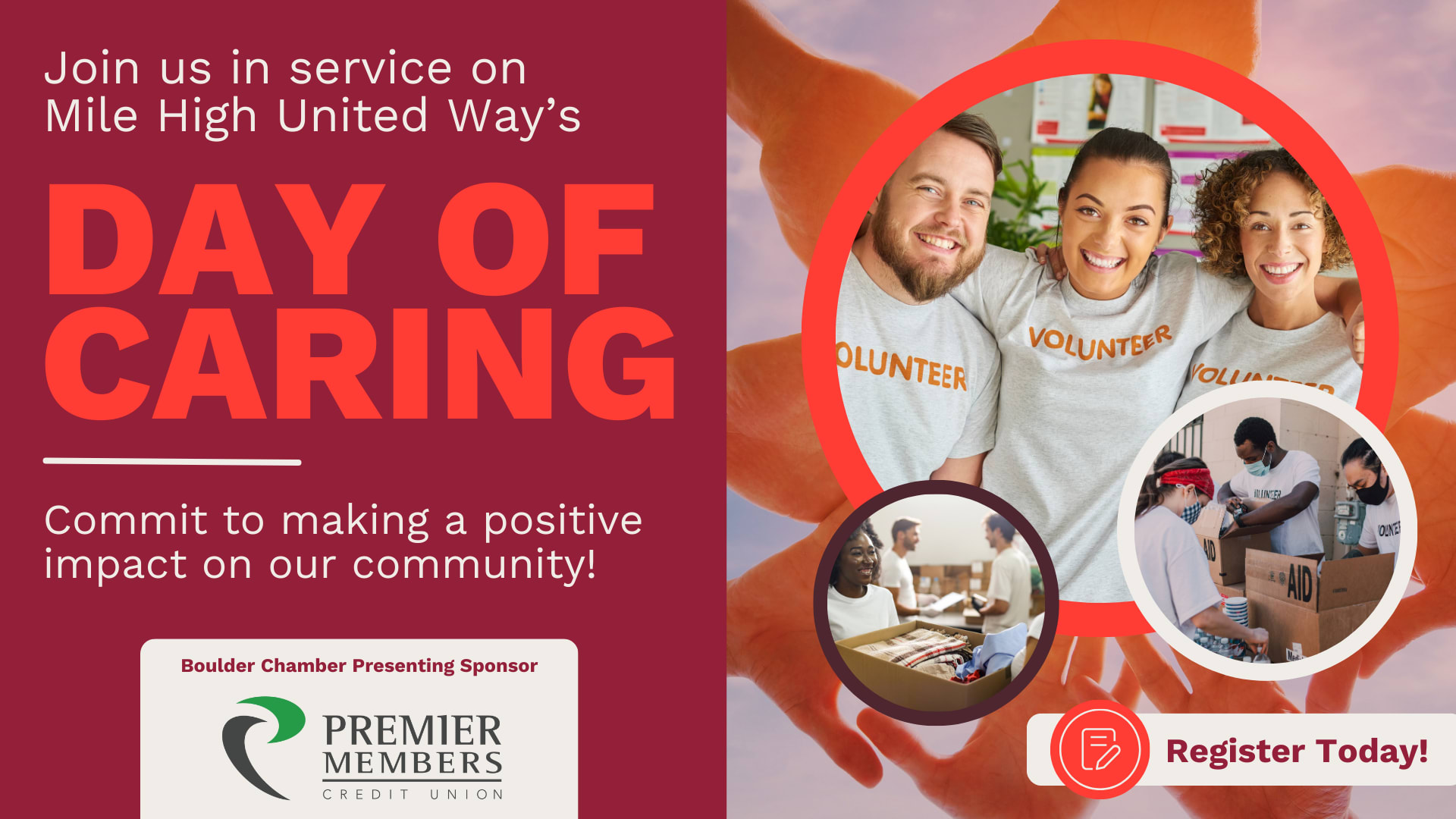 Following your day of volunteering and community service, join us for a delicious Volunteer Appreciation Lunch from Savory Cuisine and Rayback Collective, brought to you by Premier Members Credit Union and the Boulder Chamber, starting at 11:30AM.