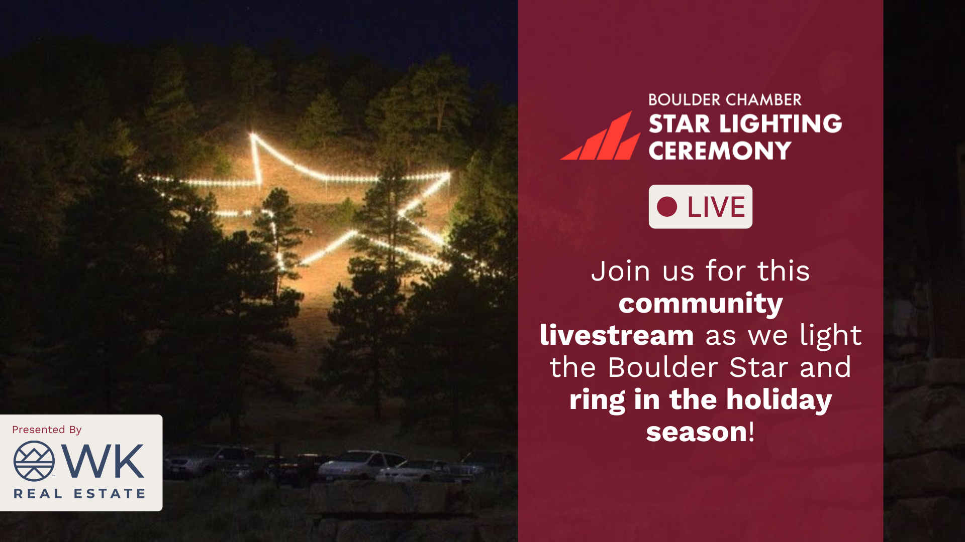The Boulder Chamber invites you to a special community livestream kicking off the holiday season and the annual lighting of the Boulder Star on Flagstaff Mountain, Tuesday, November 11. Held on Veterans Day, this cherished tradition honors the Active U.S. Military and Veterans who protect our community and nation every day. In partnership with the CU Boulder Veterans Alumni Association, the evening will feature a Joint Service Color Guard.
