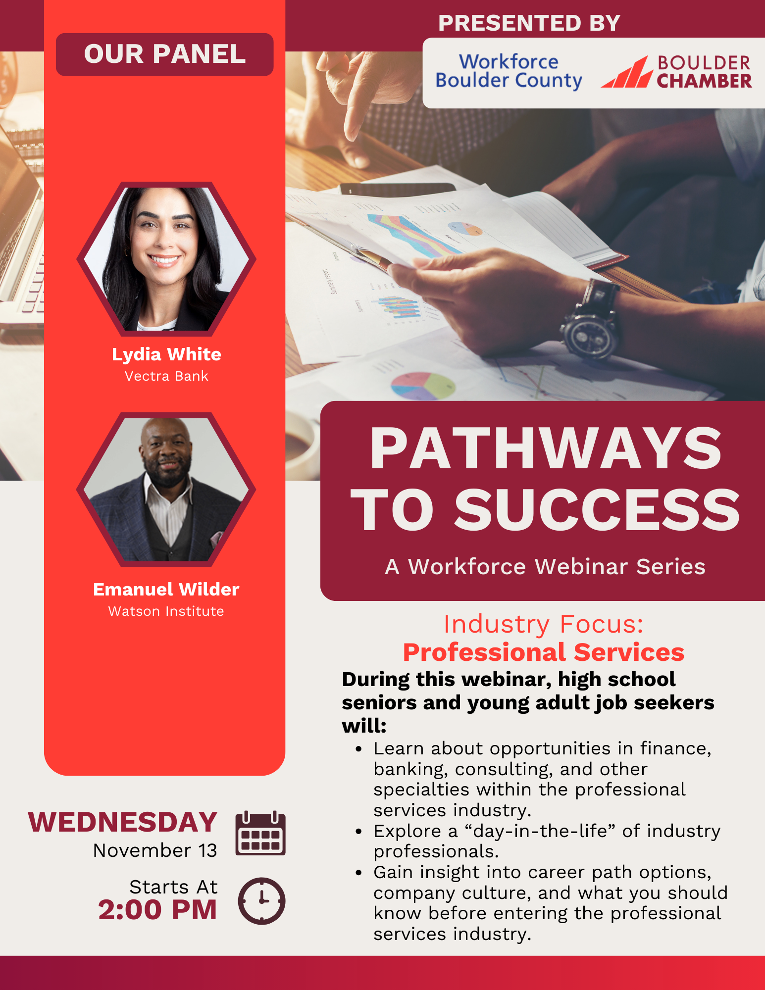 The Chamber and Workforce Boulder County are excited to bring you the third installment in the Pathways to Success Workforce Webinar Series with a Professional Services focused panel. Panelists include Lydia White, Assistant Vice President and Branch Manager at Vectra Bank, and Emanuel Wilder, Programs Manager at Watson Institute. During the webinar, high school seniors and young adult job seekers will: