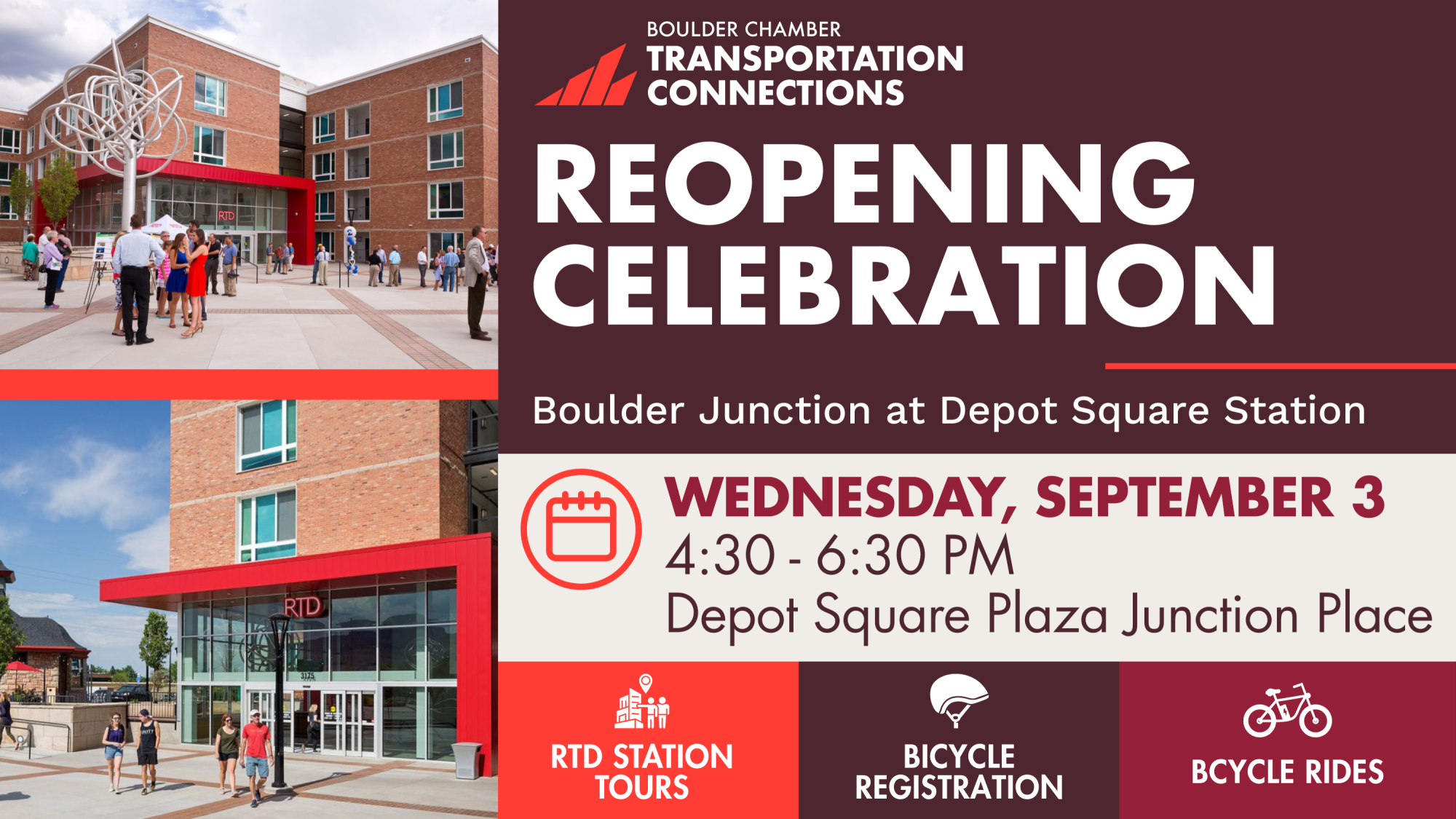 Celebrate the long-awaited reopening of Boulder's beautiful transit center in the heart of the Boulder Junction neighborhood with us on Wednesday, September 3! Join Boulder Chamber Transportation Connections, RTD, the City of Boulder, Colorado CarShare, BCycle, and Lime as we kick off the return of bus service to the underground station and orient neighborhood residents and workers to the transportation benefits connected with the special district.