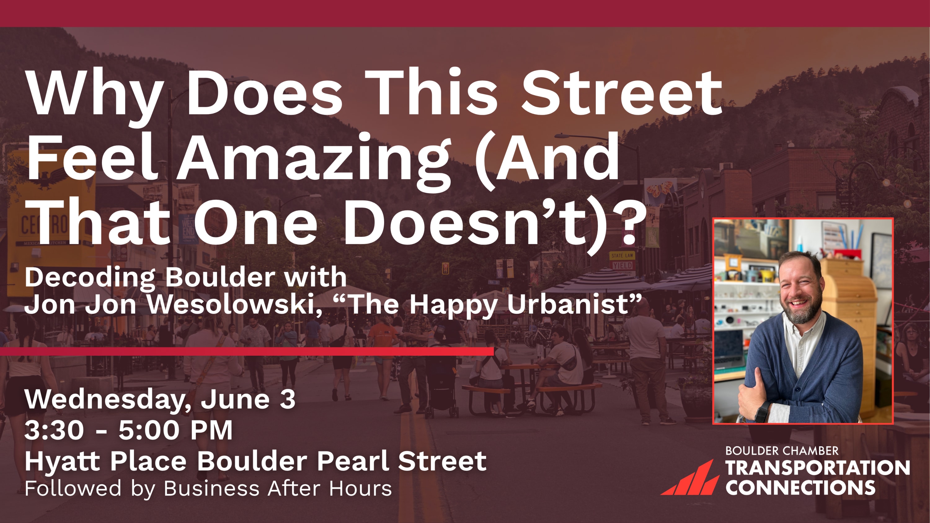 Join us for an unforgettable evening with Jon Jon Wesolowski, known to millions as The Happy Urbanist, as he answers these questions and more with his signature blend of street-level storytelling and strategic problem-solving to Boulder.