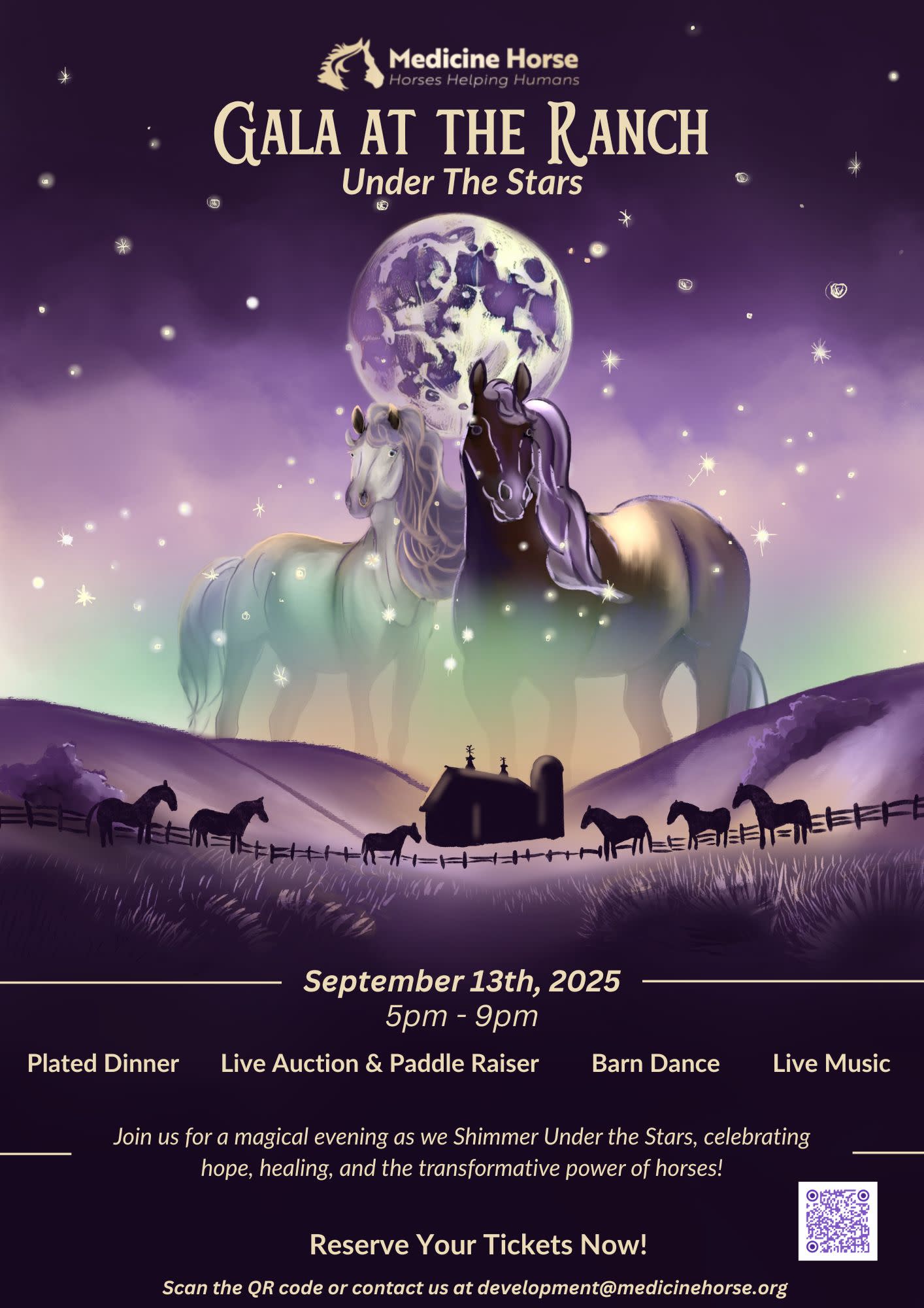 Join us for an unforgettable evening where the magic of Medicine Horse comes alive beneath the breathtaking Colorado sky. As the sun sets behind the majestic mountains, we’ll gather with friends—old and new—surrounded by music, laughter, and the warmth of community and the beauty of horses. Savor a gourmet dinner, sip handcrafted cocktails, and dance under a canopy of stars. 💫