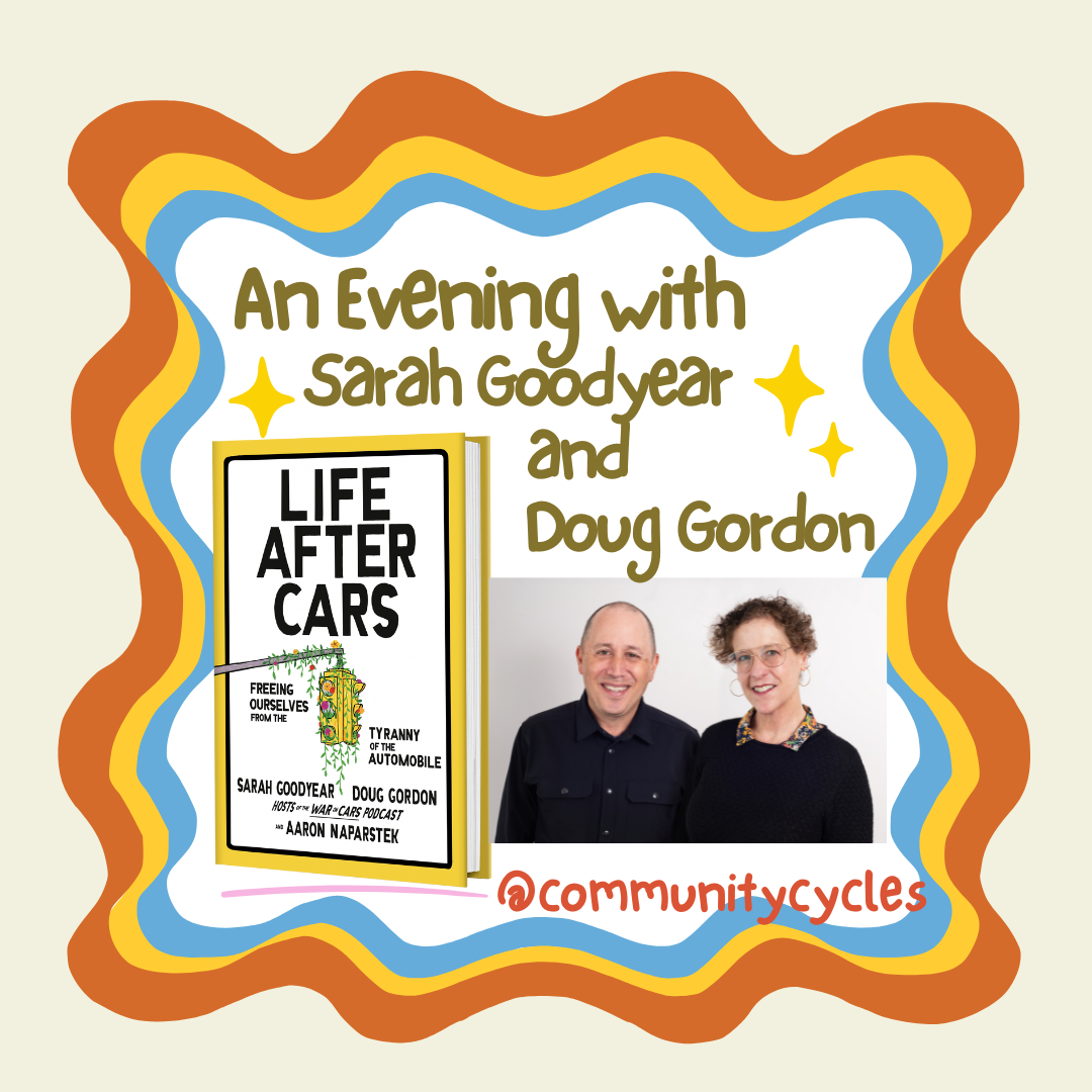 Join Community Cycles for an evening with authors Sarah Goodyear and Doug Gordon, the hosts of "The War on Cars" podcast. Sarah and Doug will inspire us with readings from their book, engage with our audience with a Q&A, then sign books and continue conversations about growing a culture of transportation cycling in Boulder. Doors open at 6:30pm, talk is at 7:00pm.