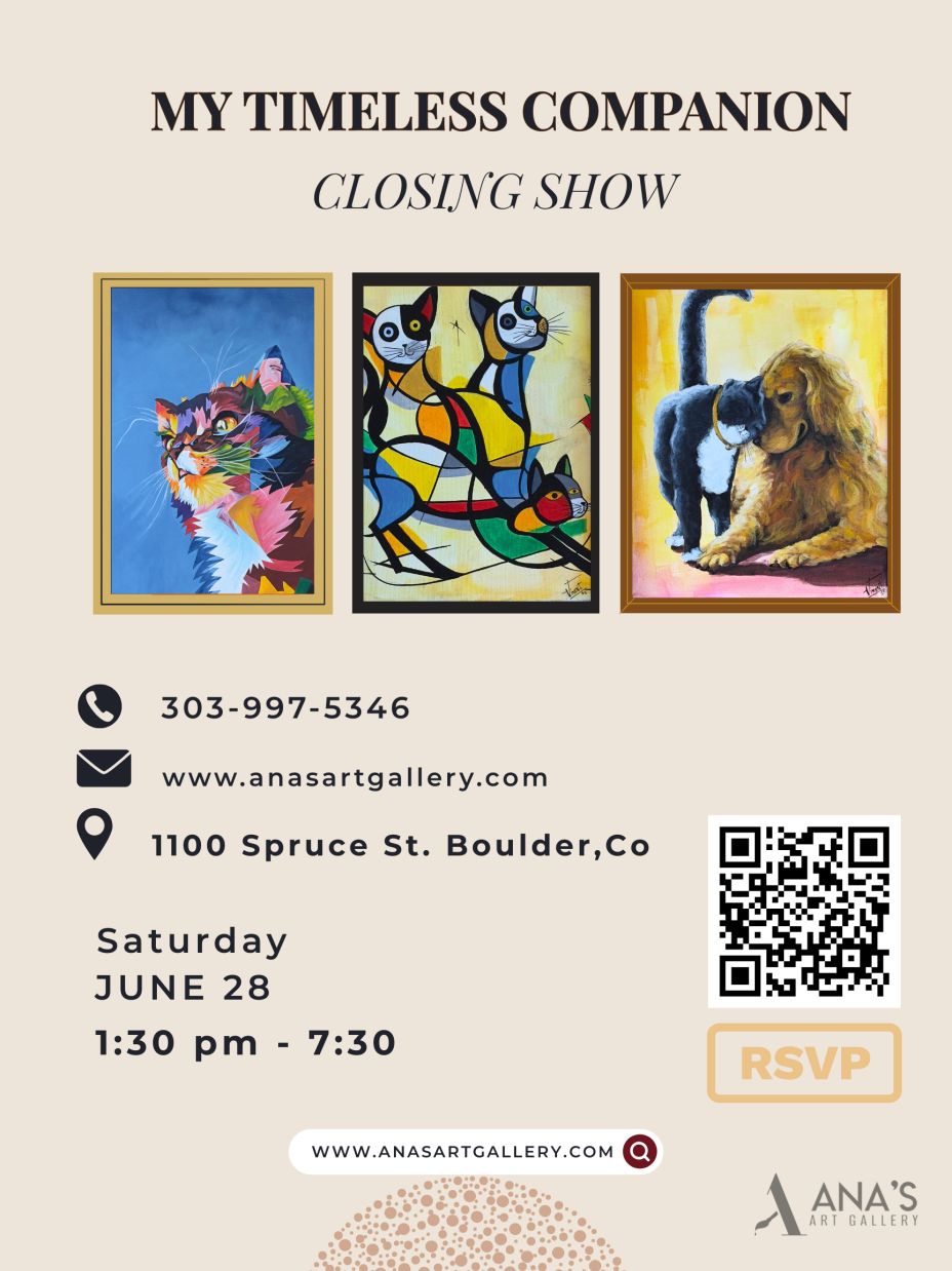 Join us for the closing reception of My Timeless Companion, a heartwarming art exhibition honoring the unconditional love and loyalty of our beloved pets. This final showing brings together the work of three talented artists: Armando Torres Jorge Vinent Nathaniel Lokua (local artist) Through vivid color, texture, and emotion, these artists capture the deep bond between humans and their four-legged companions — celebrating dogs, cats, and the timeless joy they bring to our lives. 📅 Date: Saturday, June 28, 2025 🕒 Time: 1:30 PM – 7:30 PM 📍 Location: Ana’s Art Gallery 1100 Spruce St, Unit #101, Boulder, CO 80302 This is your last chance to see this beautiful collection before it closes. Stop by to experience the art, connect with fellow pet lovers, and celebrate the companions who leave pawprints on our hearts. Admission is free and all are welcome.