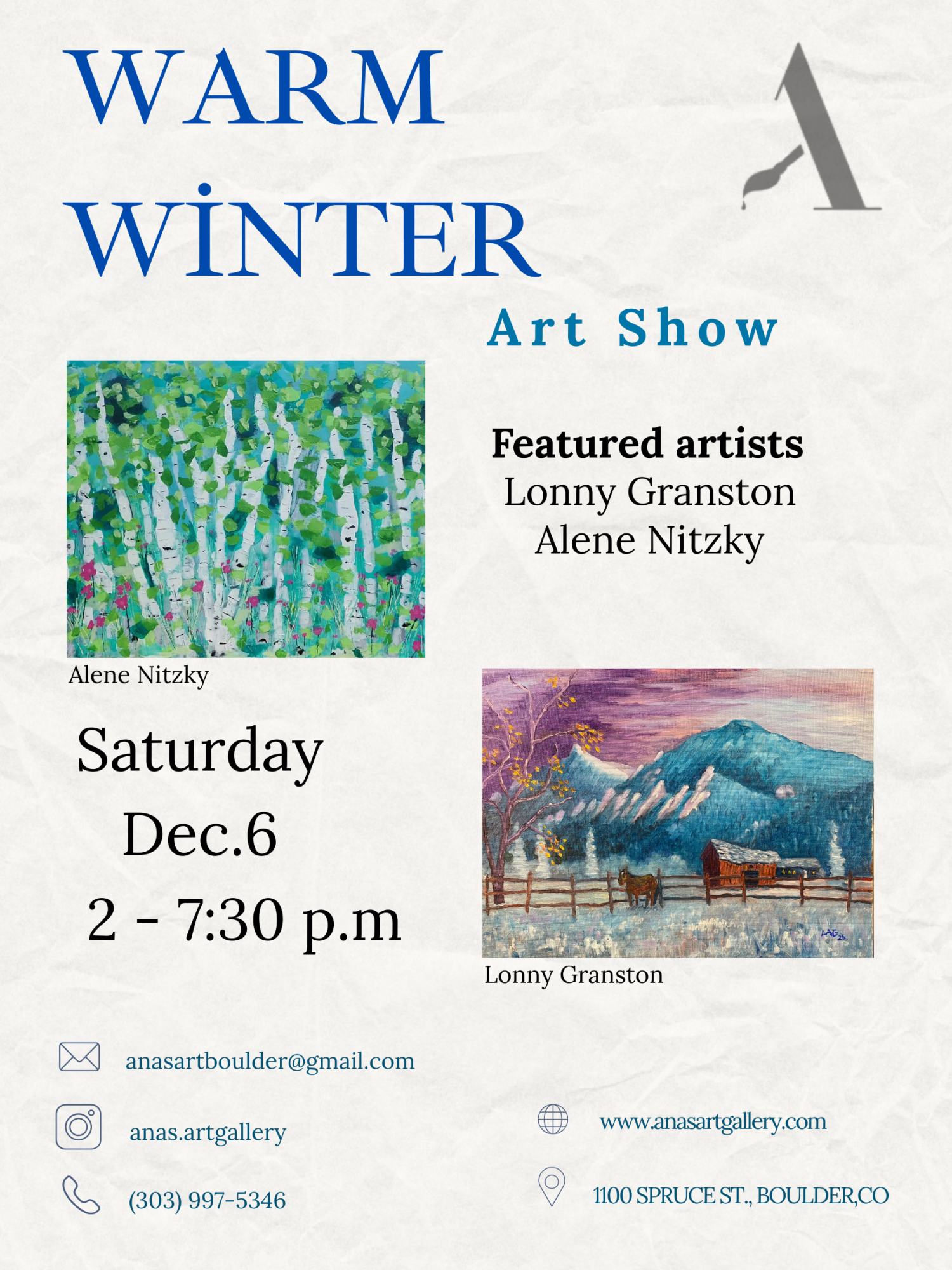Warm Winter Art Show Join us on Saturday, December 6th from 2 to 7:30 p.m. at Ana’s Art Gallery for the Warm Winter Art Show, featuring the vibrant works of artists Lonny Granston and Alene Nitzky. Enjoy a cozy winter atmosphere while exploring colorful landscapes and expressive paintings. Visit us at 1100 Spruce St., Boulder, CO, and connect with the gallery through Instagram @anas.artgallery or at anasartgallery.com.