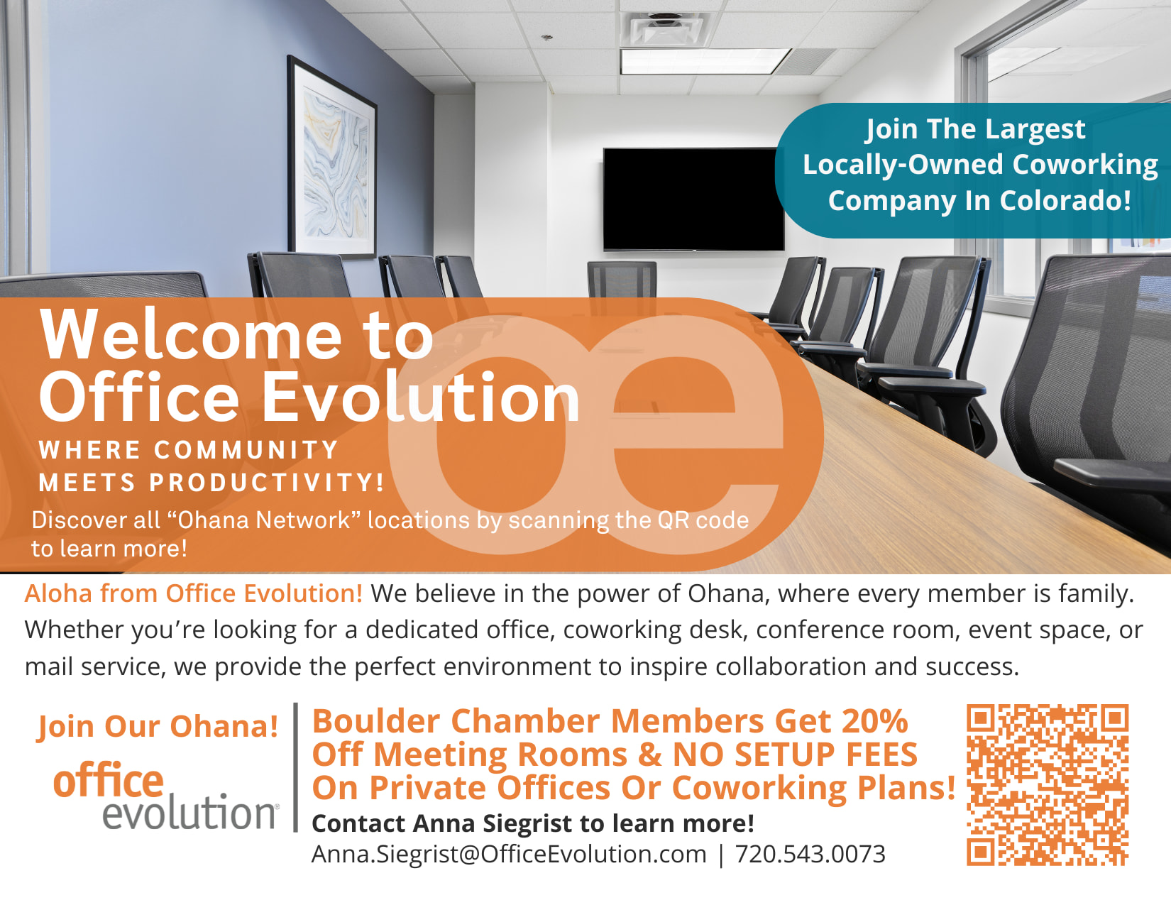 Welcome to Office Evolution Boulder, the original coworking and shared-workspace location, started by a Boulder-Native Entrepreneur in 2003! Boulder Chamber members can enjoy 20% off Meeting Rooms PLUS No Setup Fees On Private Offices & Coworking Plans!