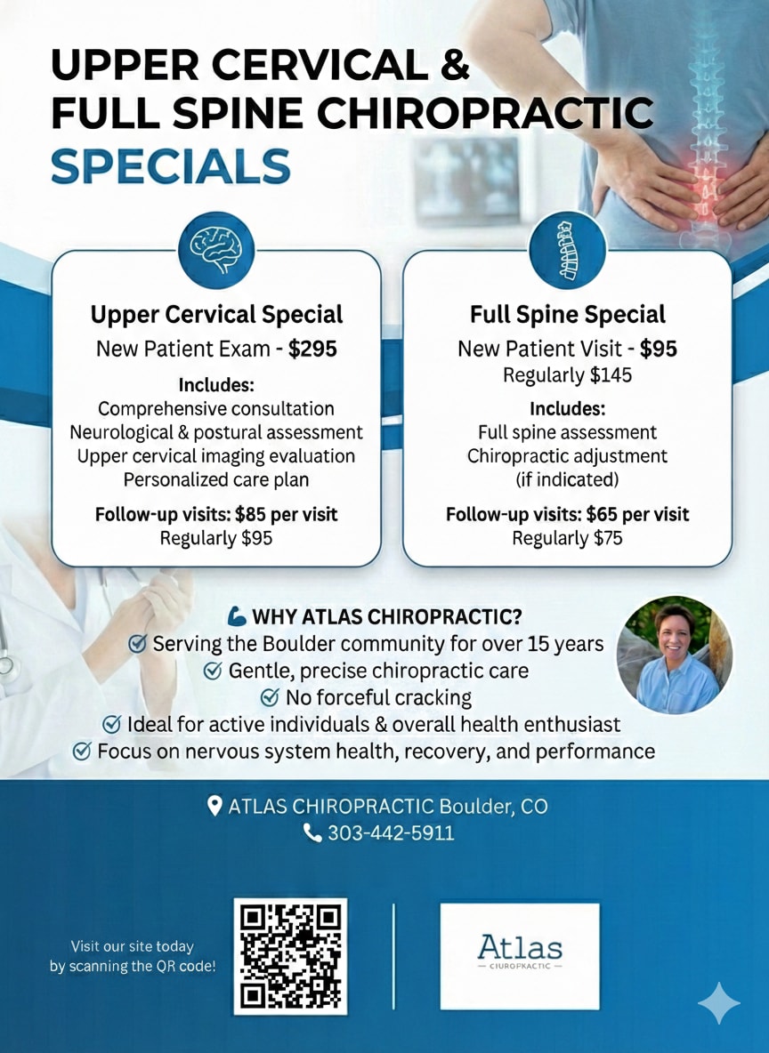 Dr. Kate at Atlas Chiropractic is excited to offer exclusive specials to our fellow Boulder Chamber members. We provide gentle, precise chiropractic care focused on nervous system health, recovery, and performance—with no forceful cracking.